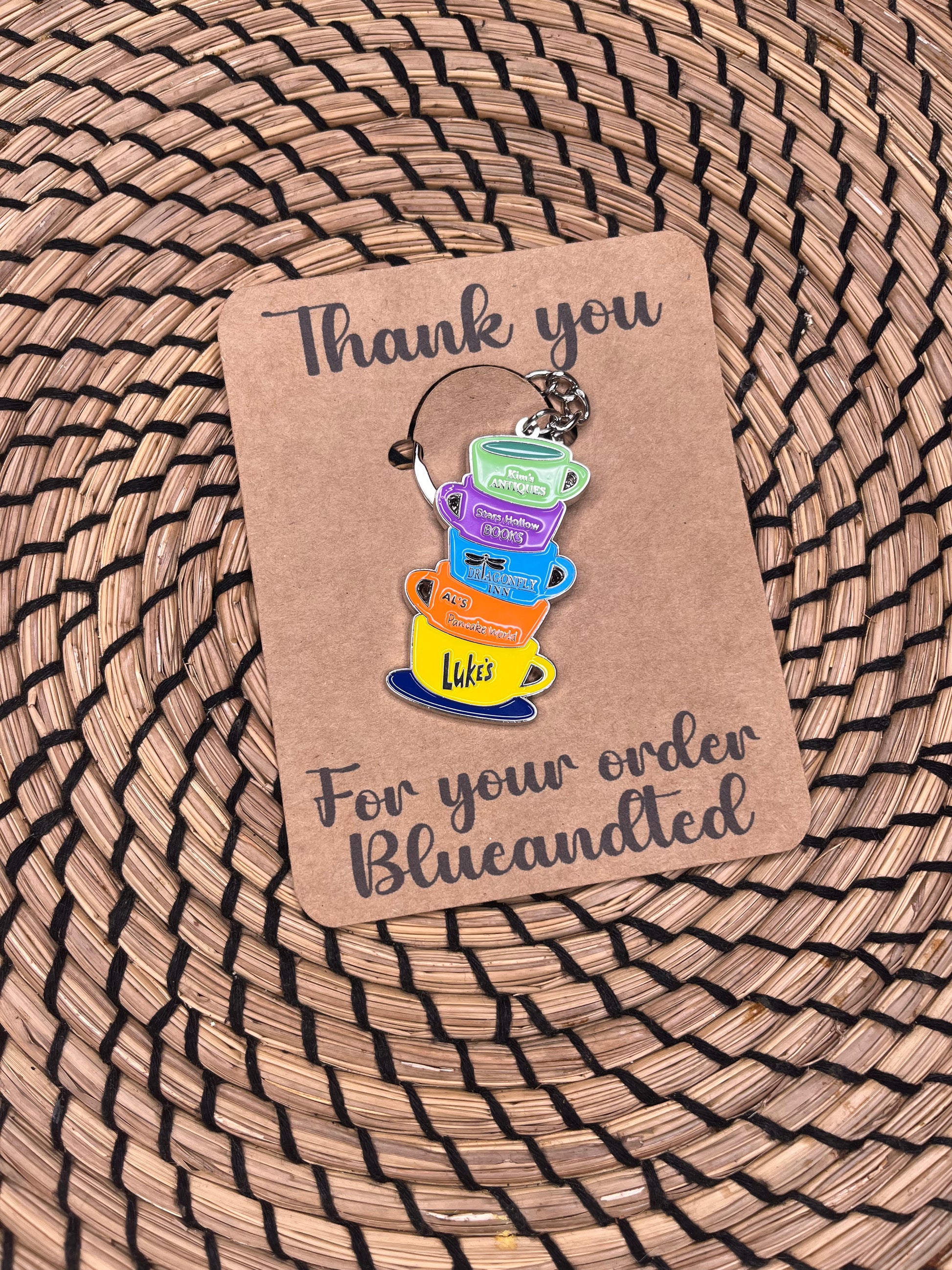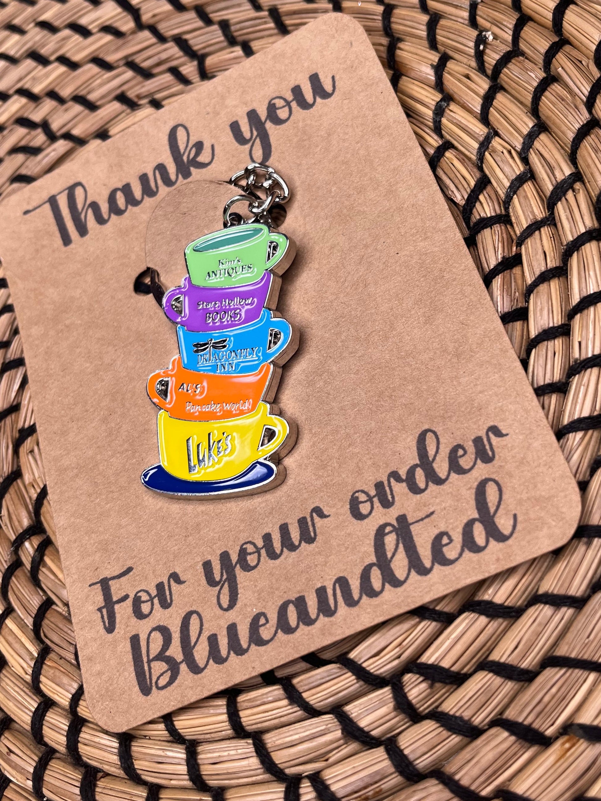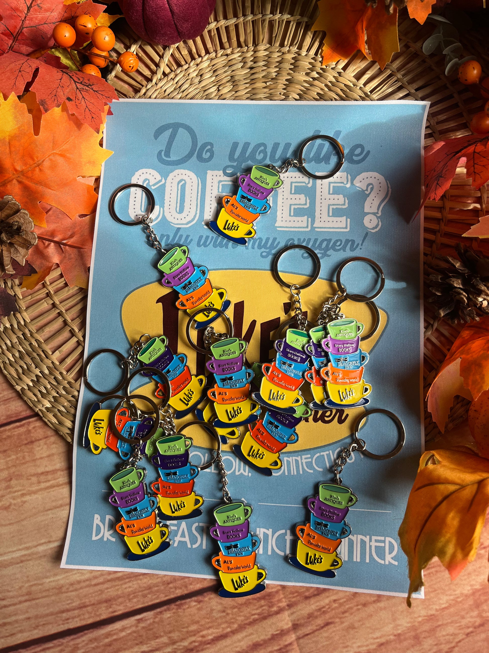 Celebrate your love for G Girls with this charming enamel keyring featuring a stack of colourful mugs from iconic Stars Hollow spots.