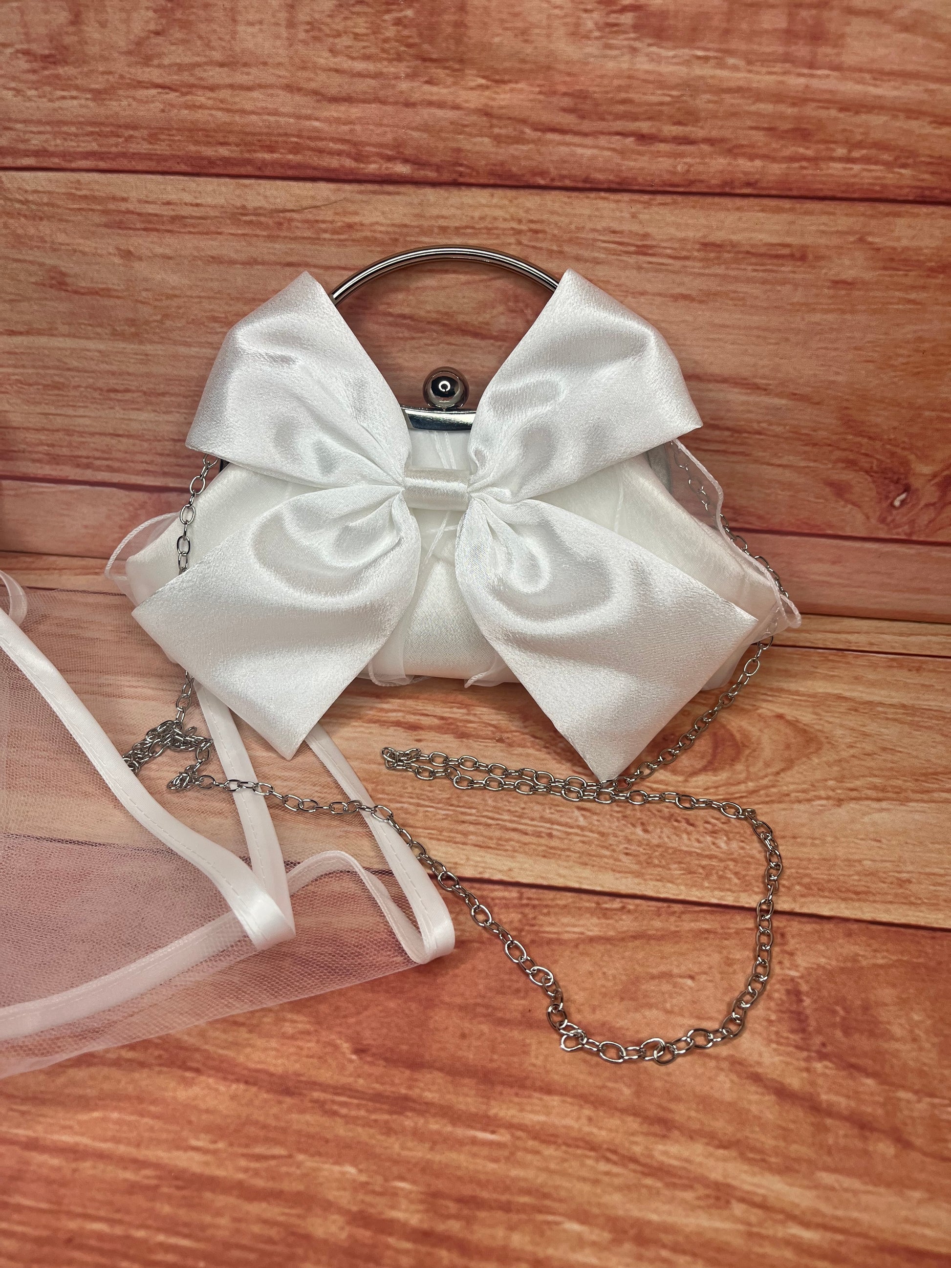 This delicate white (or black) satin bag features a statement bow with soft tulle detailing underneath, finished with a sleek silver clasp and a detachable long chain for effortless carrying.