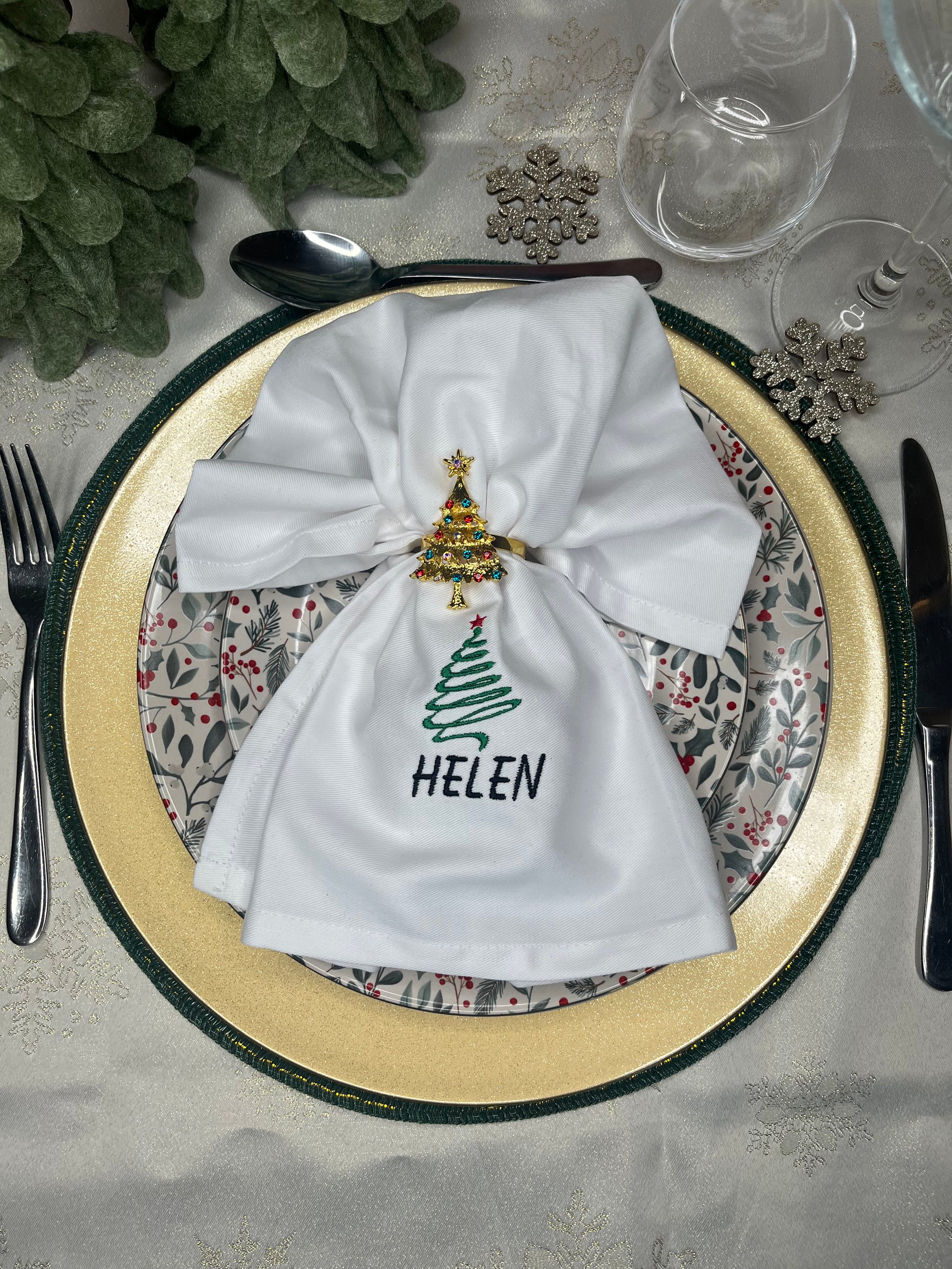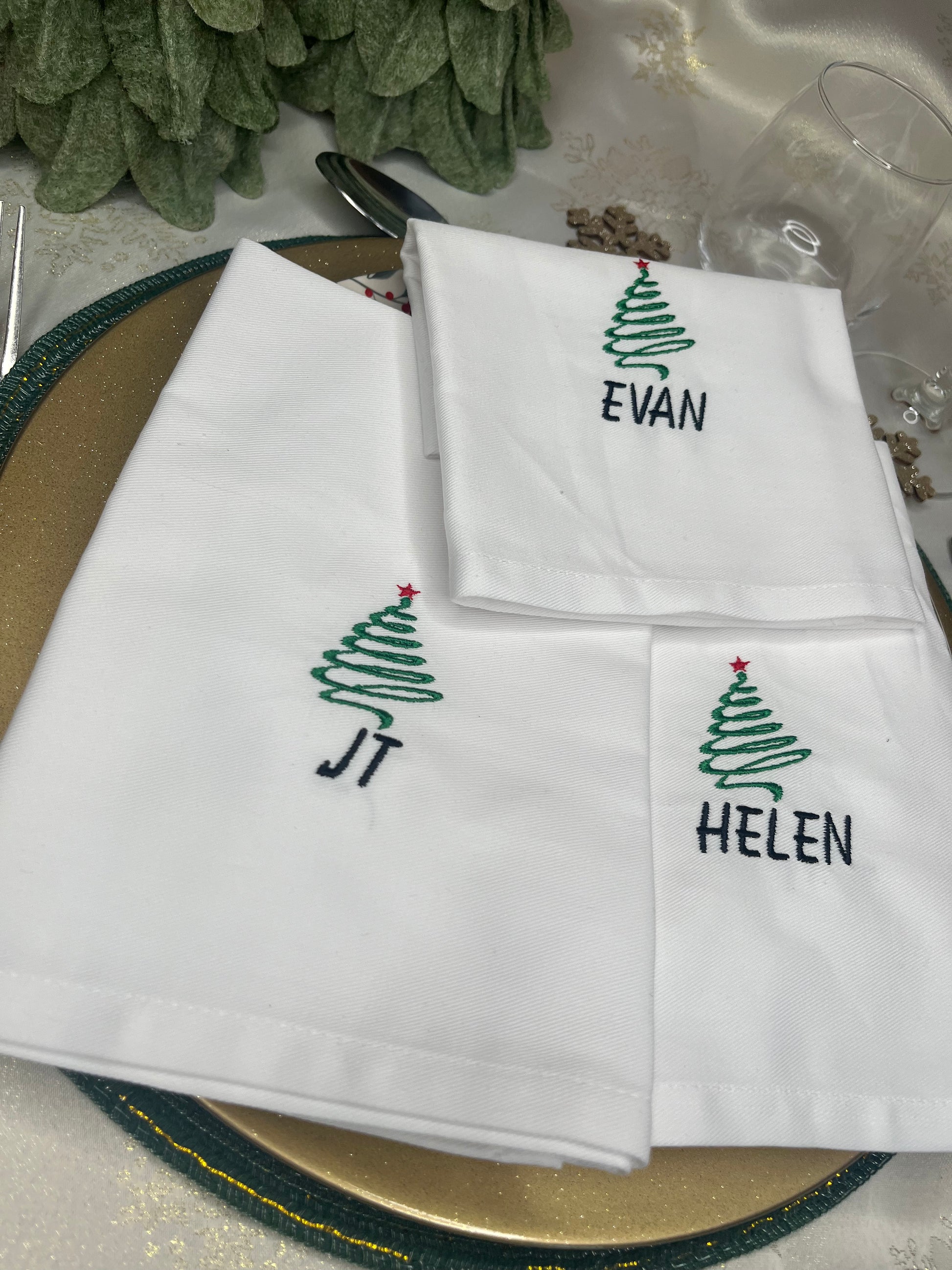 Elevate your Christmas dinner table with our luxury hotel-quality napkins, embroidered with a Christmas tree and each guest’s name for that perfect festive finishing touch.